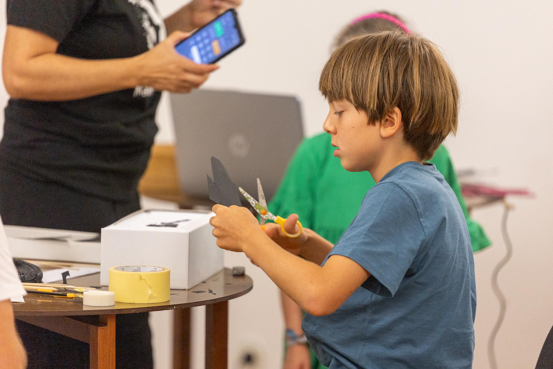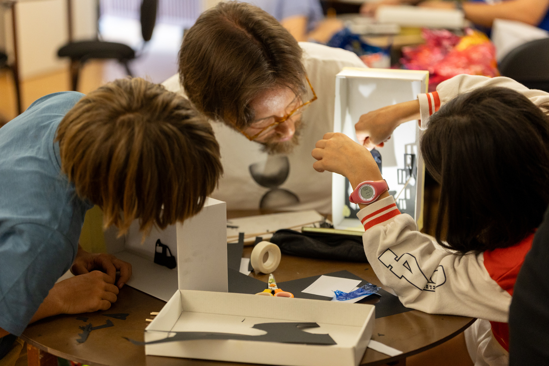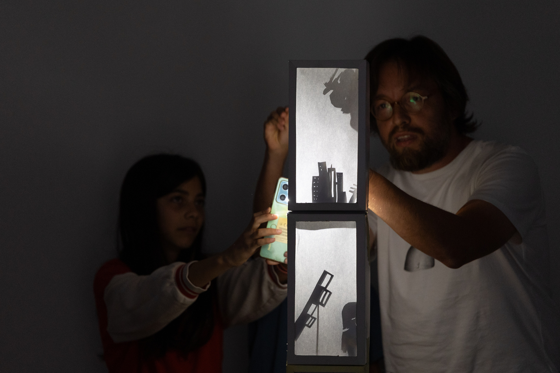 As oficinas de teatro de sombras consistem, numa primeira fase, na apresentação de um pequeno espetáculo de sombras. Este pequeno espetáculo servirá de inspiração aos mais pequenos para criarem as suas personagens encantadas que a seguir criam e experimentam na tela.